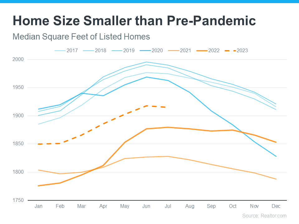 In some ways, smaller homes are already here. When the pandemic hit, the meaning of home changed. People needed the space their home provided not only as a place to live, but as a place to work, go to school, exercise, and more. Those who had that space were more likely to keep it. And those that didn’t were in a position where they were trying to sell their smaller house to move up to a larger one. That meant the homes coming to the market during the pandemic were smaller than those on the market before the pandemic – and that trend continues today (see graph below):